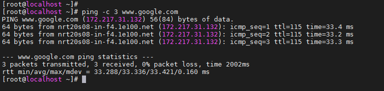 www.google.com 인 경우는 ping을 무제한으로 호출하는 옵션으로 인하여 3번 호출하고 관련된 결과값을 받을 수 있습니다.
