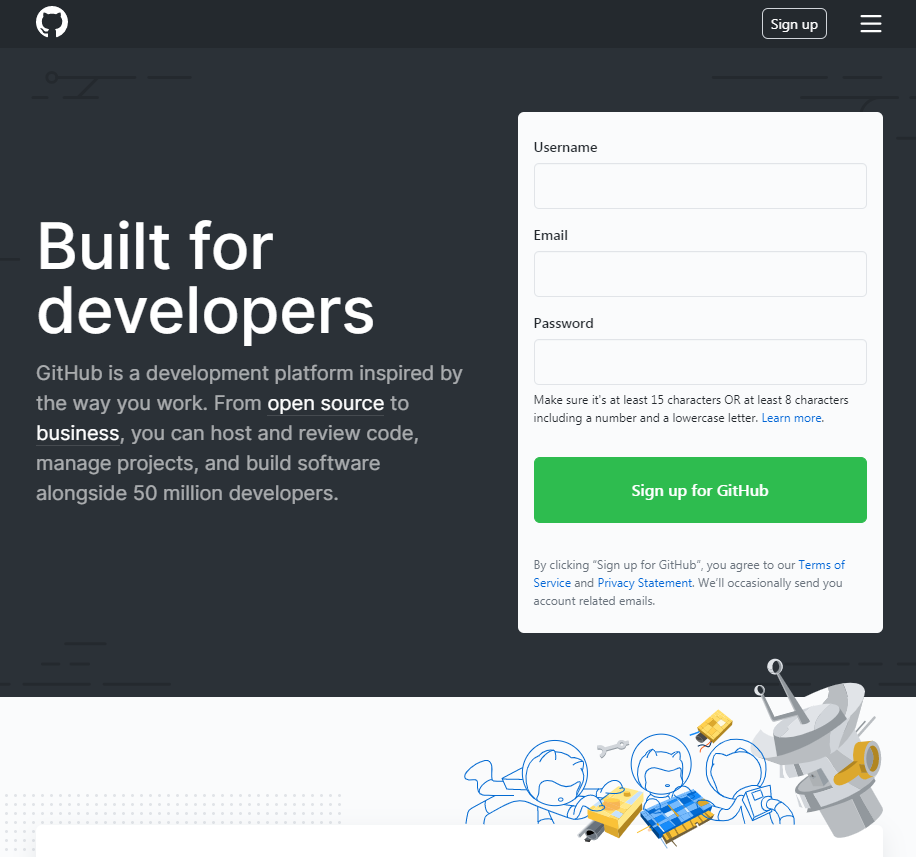 1. GitHub 사이트에 접근하여 "Sign up for GitHub" 버튼을 클릭합니다.
