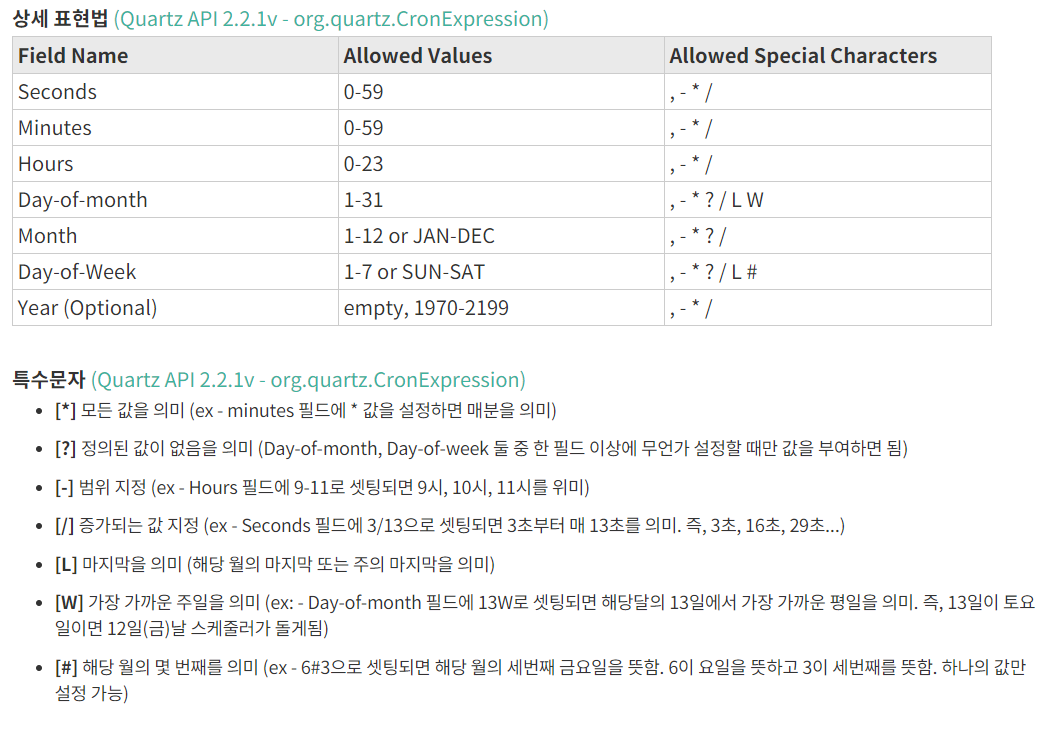 - Unix및 Linux의 cron tab의 표현식과 동일하고 기본 표현식은 "초 분 시 일 월 요일 연도(옵션)"으로 설정