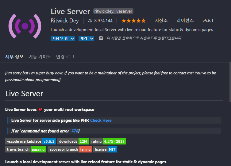 Live Server는 코딩한 프로그래밍을 실시간으로 브라우저에 바로 적용하여 확인이 가능한 가상서버를 말합니다. Live Server 플러그인을 설치하게 되면 Visual Studio Code 우측하단에 Go Live라는 아이콘이 나타나며, 아이콘을 클릭 시 브라우저에서 실시간으로 확인이 가능합니다.