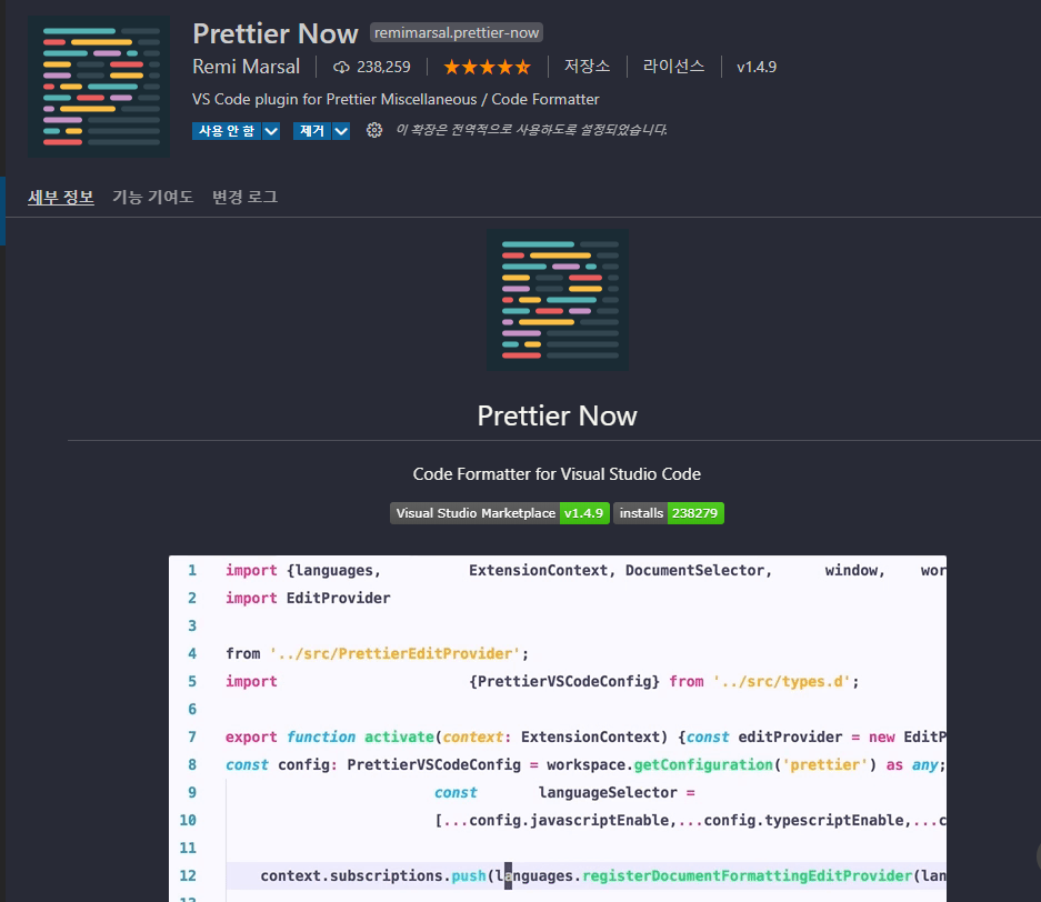 Prettier Now 플러그인은 프로그래밍 코드 파일저장시 포맷에 맞도록 소스 코드가 정렬되며 까끔 하게 구조화되어 저장되는 플러그인입니다. 예를 들어 Javascript 코드를 작성하여 저장 시 Javascript 파일 포맷과 정렬되며 html 코드를 저장 시 html 파일 포맷 형식으로 정렬되어 저장됩니다.