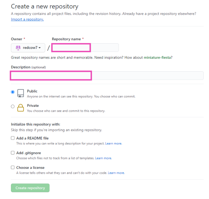 저장소이름(Repository name)과 저장소 설명(Description)을 설정하고 Create repository 버튼을 클릭하게 되면 저장소가 생성됩니다.