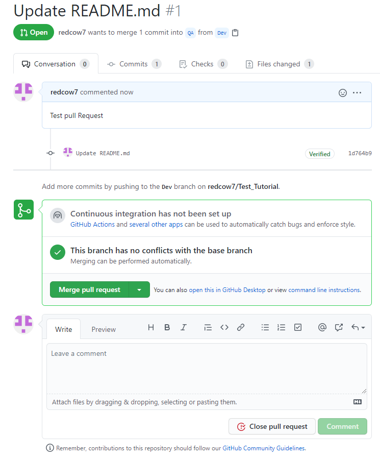 1번 브랜치(Branch)에서 2번 브랜치(Branch)로 Pull request를 할수 있습니다.
