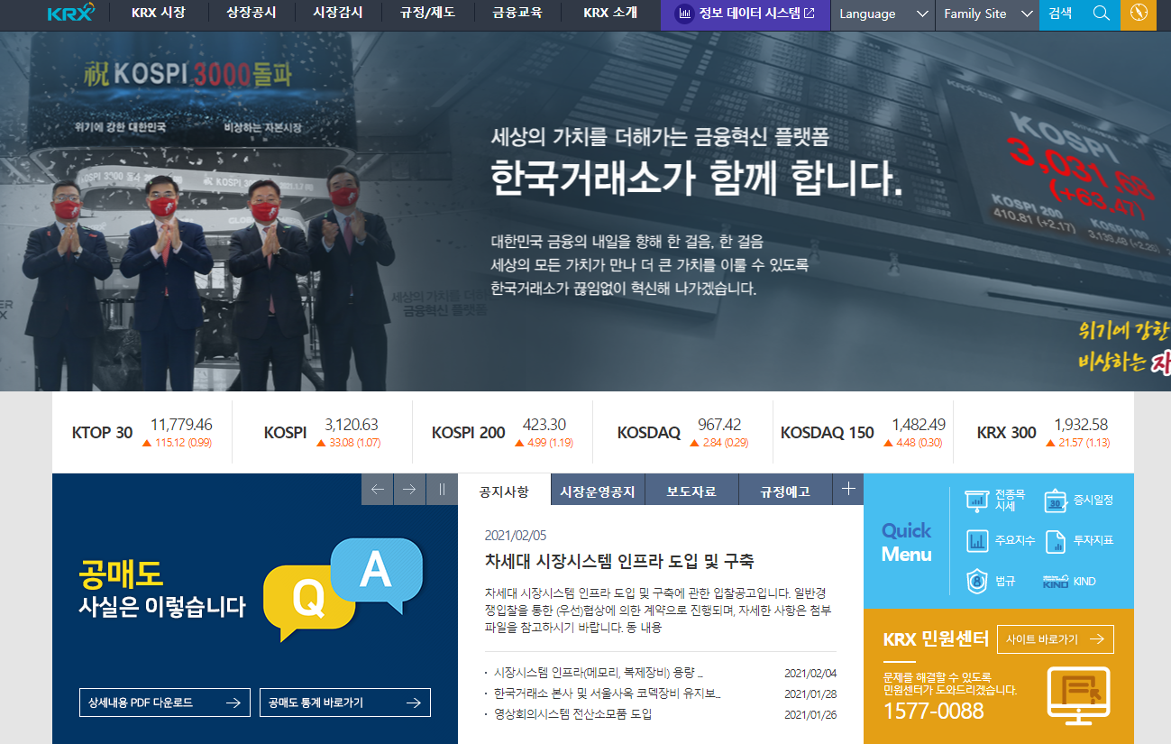 한국거래소 홈페이지 메뉴에 있는 정보 데이터 시스템을 클릭하게 되면 KRX 정보시스템 페이지를 접근이 가능합니다.