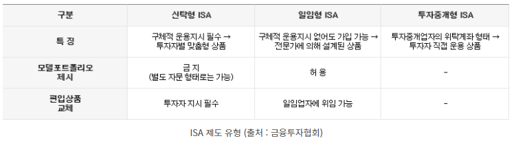 ISA 유형으로는 투자자가 1:1로 운용 지시하는 신탁형 ISA가 있고, 투자자별 맞춤형인 일임형 ISA이 있으며, 추후 생성될 투자 중개형 유형이 있습니다.