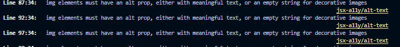 React에서 흔히 볼 수 있는 에러입니다. 이는 코드규칙을 관리할때 사용되는 라이브러리 eslint에서 제공되는 경고로써 react.js의 img 태그를 사용할 때에는 alt를 작성하지 않았다는 Error입니다. 사실 alt를 작성하지 않아도 되지만 표준에 맞게 사용하려면 alt를 빼면 안 됩니다.