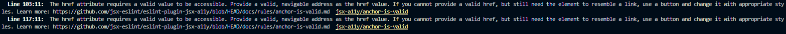 React에서 흔히 볼 수 있는 에러입니다. 이는 코드규칙을 관리할때 사용되는 라이브러리 eslint에서 제공되는 경고로써 react.js의 <a> 태그를 사용할 때에는 href의 유효성값이 필요하다는 Error입니다.
